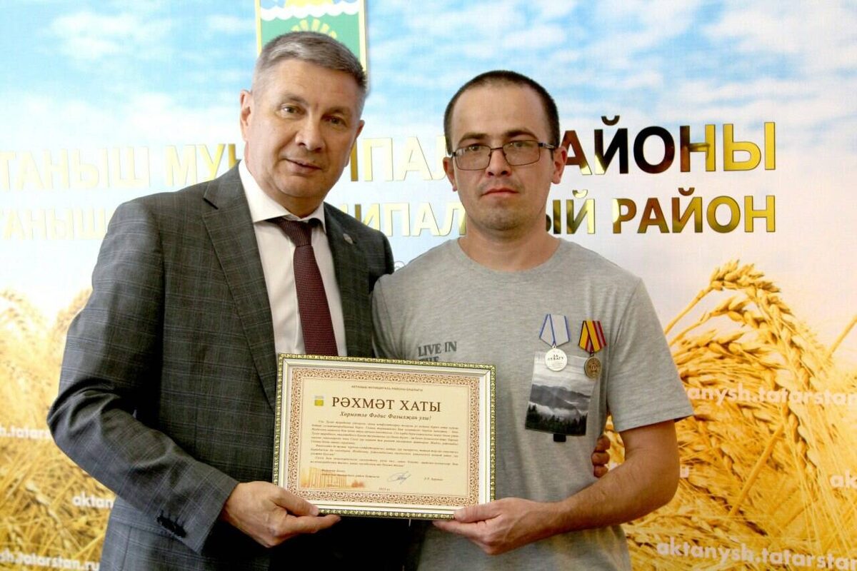 Автор: Эльза Кузнецова В торжественной обстановке в администрации Актанышского района состоялось вручение государственной награды – медали «За отвагу» – участнику специальной военной операции Фадису Гарипову. Почетную награду бойцу вручил глава района Ленар Зарипов в присутствии его родных – родителей, жены и сына. Фадис Гарипов был мобилизован с первых дней СВО и с самого начала проявил себя как мужественный и самоотверженный боец. За проявленную отвагу и преданность Родине он заслуженно был удостоен медали. В этот день Фадис также получил медаль участника специальной военной операции. Глава района выразил слова признательности семье Фадиса, особо подчеркнув роль родителей, воспитавших сына честным, человечным и стойким. «Вы воспитали настоящего героя, и мы гордимся такими людьми, как ваш сын», – сказал он. Ранее Раис Татарстана Рустам Минниханов рассказал на встрече с Президентом России Владимиром Путиным в Московском Кремле, что из республики на специальную военную операцию ушли 38