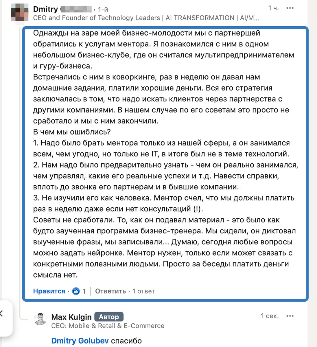 Вот опыт людей, кто нанимал (платил) ментора для своего ИТ- бизнеса