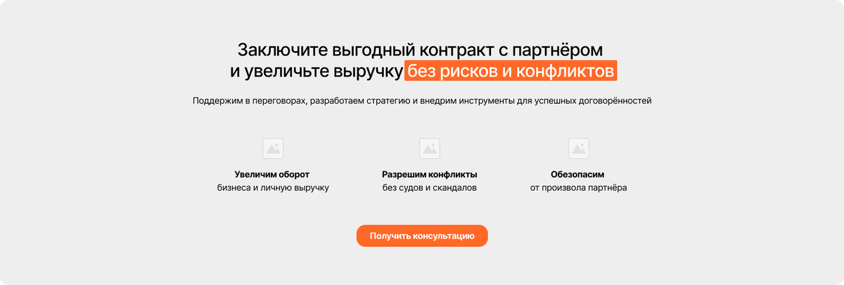 Подкрепляем всё фактом: 70% бизнесов сталкивались с подобными проблемами из-за необдуманных партнёрских отношений. Этот блок текста работает сразу в двух направлениях. Во-первых, мы показываем, что готовы помочь с текущими спорами и конфликтами. Во-вторых, мы подчёркиваем, что можем выстроить новые отношения так, чтобы подобных ситуаций вообще не возникало. Например, за счёт грамотного прописывания зон ответственности, последствий и понимания, как партнёрства рушатся и что нужно сделать, чтобы убрать эти риски на корню.