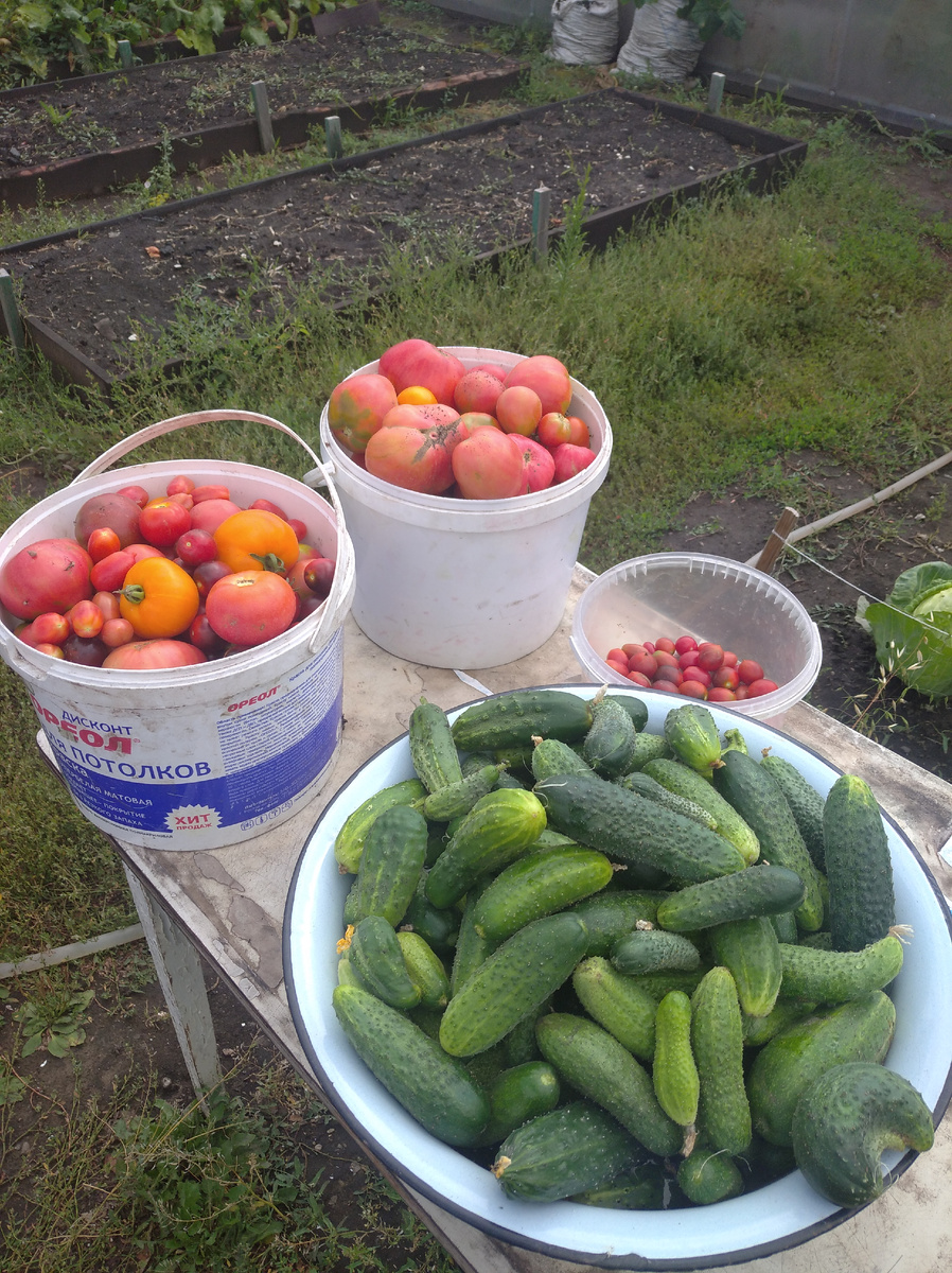 Привет, друзья . Сегодня на даче первый день подходит к завершению . Села в кресло на кухне , сижу дышу, жду мальчишек из бани , потом я ) На улице был сильный ливень , ура ,не поливать . Сегодня проснулись на даче ,позавтракали и пошла собирать помидору и огурцы . Вот что получилось В тазу тоже два ведра . Итого 4 . И лук с чесноком начистила ,и выдернула два последних качана капусты -репы. Опять забыла ее название Все намыла , попки у огурцов обрезала Забыла, набрала ещё 3 литра жёлтой сливы , находила рецепты что ее можно тоже в сад- огород для аромата ))) В итоге что такое 4 ведра это 10 трешек , 1 двушка и 1 литровая . Только закончила . Между дел был конечно и обед ,и ужин , но все же только 1 большое дело за целый день. Планировала убрать выдрать из теплицы огурцы . Пожелтели и никаких завязей что то . Но перед отъездом полила их подкормкой . И ...собрала ведро именно на этой грядке . Завтра перед отъездом ещё раз полью опять же таким же раствором , посмотрю что будет в сле