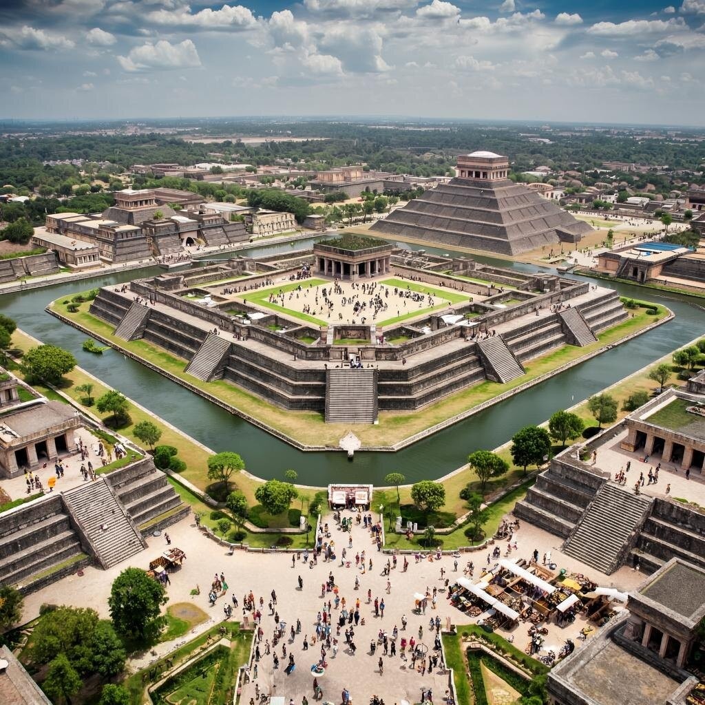 Архитектурный ансамбль столицы включал также впечатляющие храмы-пирамиды, такие как Пирамида Солнца и Храм Великого Бога Войны, подчёркивающие мощь и богатство империи. Ирригационная система позволяла эффективно заниматься сельским хозяйством даже на заболоченных территориях.