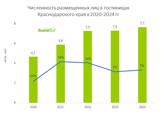 По данным «Анализа рынка гостиничных услуг в Краснодарском крае», подготовленного BusinesStat в 2025 г, в 2020-2024 гг численность постояльцев гостиниц в регионе увеличилась на 64%: с 4,7 до 7,7 млн человек. В 2020 г временное введение запрета на размещение гостей в период пандемии привело к снижению числа постояльцев на 24%. Однако в 2021 г турпоток в край восстановился, чему способствовала программа туристического кешбэка. Благодаря развитию внутреннего туризма число принятых отелями гостей возросло на 26%. В 2022 г из-за закрытия авиасообщения со странами Европы и роста цен на выездные туры число отдыхающих в Краснодарском крае вновь возросло (на 24%), несмотря на сохранение полетов только в аэропорт Сочи (авиасообщение с Анапой, Геленджиком и Краснодаром было приостановлено). Сочетание пляжного отдыха и активного туризма, длинной береговой линии и горнолыжных курортов, возможности для отдыха с детьми, появление новых современных отелей делают Краснодарский край одним из лидеров по
