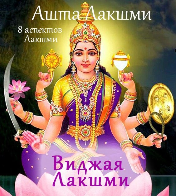 Джая (Виджая) Лакшми – дает вдохновение и надежду на победу. Помогает удерживать решительный настрой в любом деле, как в материальном, так и духовном устремлении. jaya kamalāsani sadgatidāyini jñānavikāsini gānamaye . anudinamarcita kuṅkumadhūsarabhūṣita vāsita vādyanute .. kanakadharāstuti vaibhava vandita śaṅkara deśika mānya pade . jayajaya he madhusūdana kāmini vijayalakṣmi sadā pālaya mām .. 6.. Слава той, кто восседает на лотосе, той, кто дарует удачу, Той, что распространяет знания, той, что содержится в музыке, Той, для ежедневного поклонения которой используется порошок шафрана Которым её украшают, которая воплощена в речи, Которую почитает золотым дождём великий учитель Шанкара, припав к её стопам Слава, слава тебе, возлюбленная Мадхусуданы, Виджая-Лакшми, всегда оберегай меня.