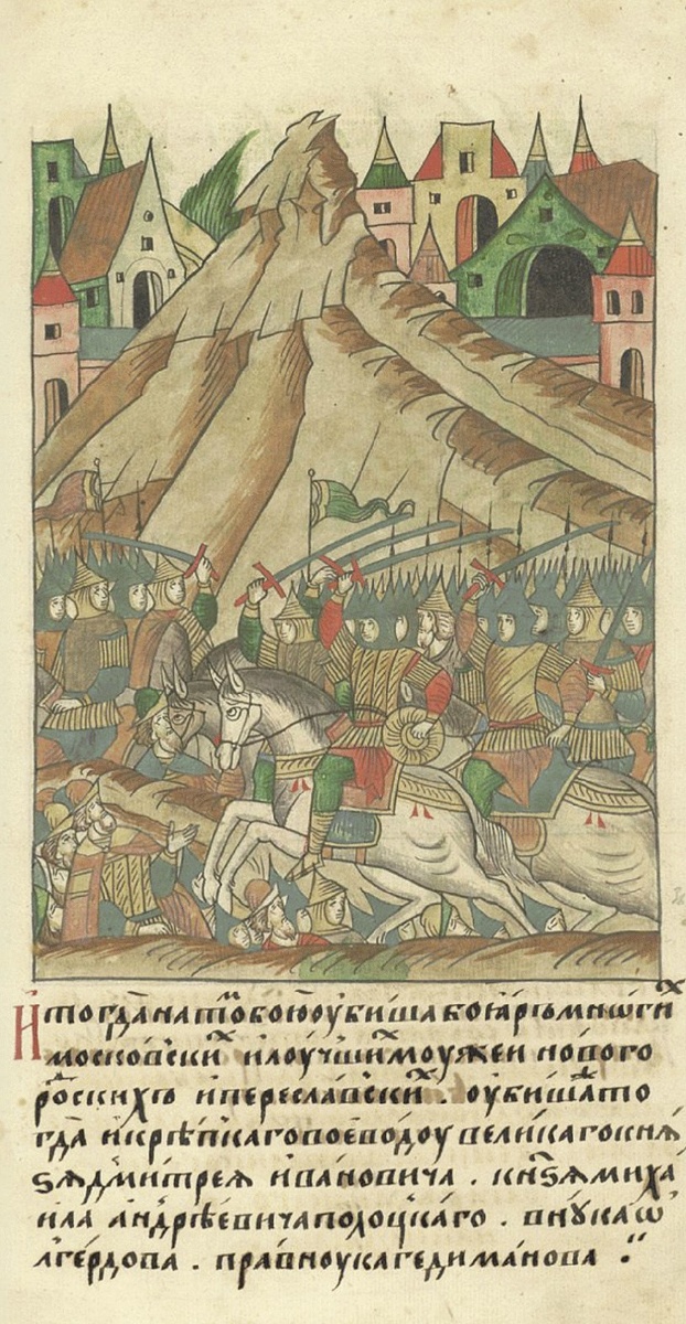«…того же лета князь великий Дмитрей Ивановичь собрав воиньства много отвсюду и посла ратью брата своего из двоюродных князя Володимира Андреевича на великого князя Олга Рязанскаго и на всю землю его…».