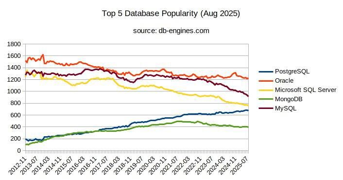 Топ 5 самых популярных баз данных в августе 2025 + как их популярность поменялась за последние 4 года 🔻 Oracle: -3,83 % 🔻 MySQL: -26,07 % 🔻 Microsoft SQL Server: -22,52 % 🔼 PostgreSQL: +16,33 % 🔻 MongoDB: -20,33 % Вот отсюда