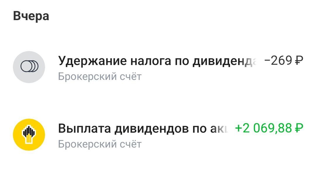 ⚡Так же вчера пришли дивиденды от Роснефти На мои 141 акцию пришло 2069.88₽, из них удержали на налоги 269₽. Чистый доход 1800.88₽ Дивидендная доходность на мои 141 акцию, грязными 2.81% или чистыми 2.45% 📌Роснефть находится у меня в просадке, поэтому доходность небольшая. В целом основные дивиденды Роснефть платит в январе, так что до конца года буду ещё докупать.