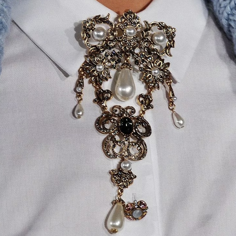 - Две броши: симметрично закрепите на уголках воротника — это напомнит винтажные образы 1950-х.