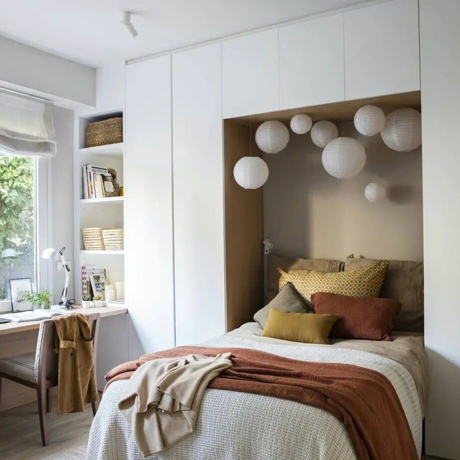 Не у каждого есть возможность разгуляться на 20 квадратах, обставив спальню и кроватью, и гардеробной, и диванчиком, и туалетным столиком. Иногда хорошо уже то, что спальня есть вообще — отдельная, пусть и скромная. Но что делать, если в ней кроме кровати ничего не помещается, а хранить одежду всё-таки где-то нужно? Выход есть. И вопреки расхожему выражению, ничего никуда «впихивать» не придётся. Можно оформить хранение вокруг кровати, встроив шкафы по бокам и сверху, тем самым создавая нишу для самой кровати. Такое решение не только функциональное, но и визуально очень уютное. Главное условие — ширина стены в изголовье не должна быть меньше 3 метров. Разберёмся, как это может выглядеть: 📌 Светлая мебель — лучший друг маленьких пространств