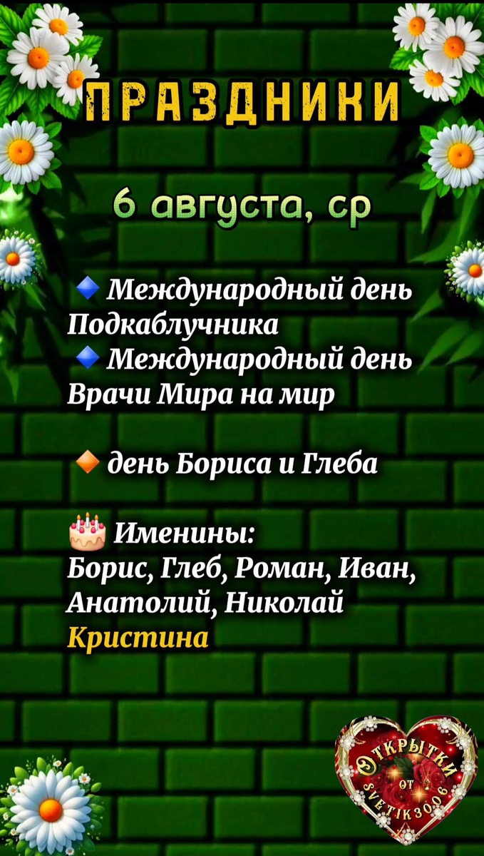 🔸️день Бориса и Глеба. 6 августа почитают святых князей Бориса и Глеба. Они были сыновьями великого князя Владимира Святославича, который крестил Русь. Братьев считают заступниками русской земли. На Бориса и Глеба внимательно следили за природой. Погода в этот день считалась предвестником осени: 💧Если шел дождь или гремела гроза — будет сырой сентябрь. 🌞Если день ясный и тихий — осень будет сухой и теплой. 🌫Сильный туман вечером — к ясному дню. 🕷Пауки вылезли из укрытий — к теплой погоде. 🪰Мухи сильно жужжат — солнечный день.
