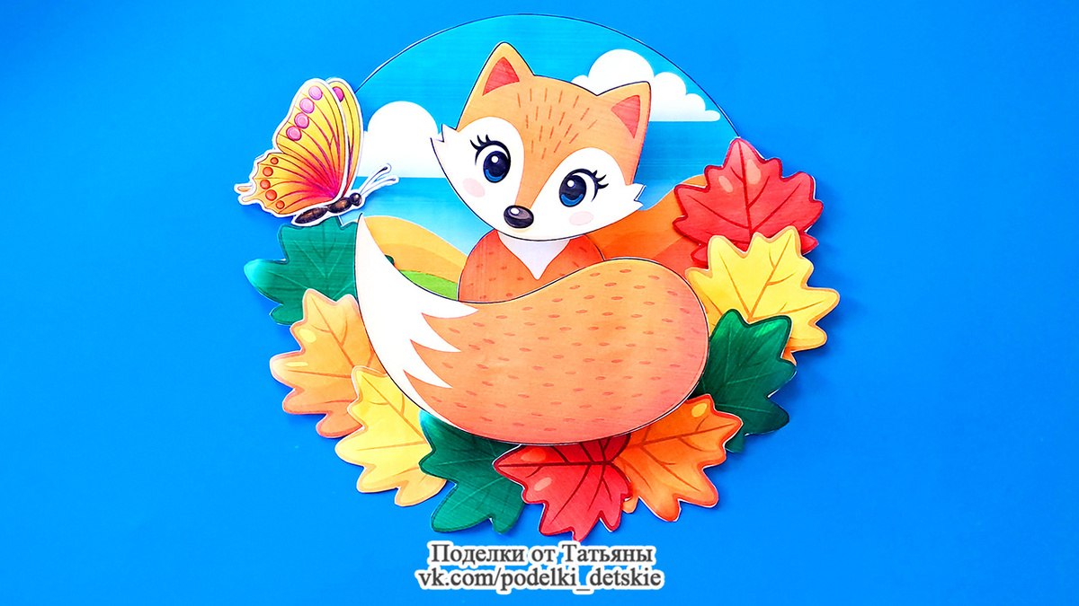 Объёмная осенняя аппликация: в центре — милая лисичка с пушистым хвостом, вокруг неё яркие кленовые листья жёлтого, оранжевого и зелёного цветов, а слева порхает красочно украшенная бабочка. Работа выполнена из бумаги по шаблонам и аккуратно собрана в слои, создавая эффект глубины и праздничного настроения. 🔒Шаблоны цветные и черно-белые доступны для скачивания по подписке. 🔑Получить доступ: https://vk.com/donut/podelki_detskie Видео: https://rutube.ru/video/3203cae8bef00c475d71beaf8290cf19/