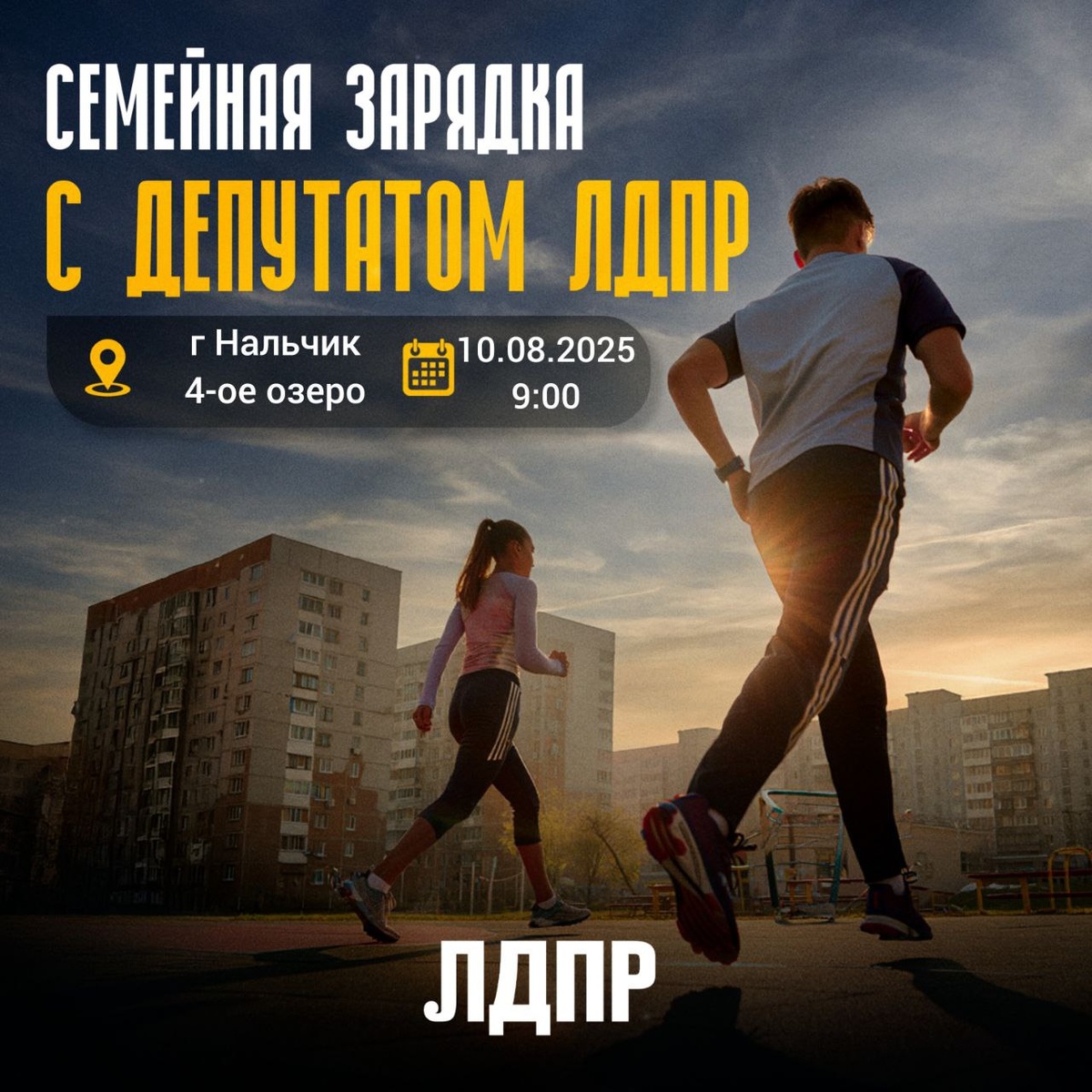 ☀️ Семейная Зарядка с депутатом ЛДПР – Зарядись Энергией вместе с нами! ☀️ Приглашаем всех жителей города Нальчик на позитивное и бодрящее утро! 10 августа в 9:00 мы ждем вас на 4-м озере на Аллее, чтобы вместе начать день с полезной и веселой семейной зарядки. Присоединяйтесь к нам, чтобы провести время активно, подышать свежим воздухом и зарядиться отличным настроением на весь день! Это прекрасная возможность провести время с семьей, укрепить здоровье и встретить утро в компании единомышленников и представителей ЛДПР. Неважно, какой у вас уровень подготовки – главное ваше желание двигаться и улыбаться! Наши инструкторы помогут каждому. Семейная зарядка – это путь к здоровью, хорошему самочувствию и позитивным эмоциям. Приходите всей семьей, приводите друзей и соседей! Вместе мы сделаем наше утро ярче и продуктивнее. 📍 Место: г. Нальчик, 4-е озеро на Аллее ⏰ Время: 10 августа, 9:00 Сделайте свой день по-настоящему энергичным! Ждем вас!