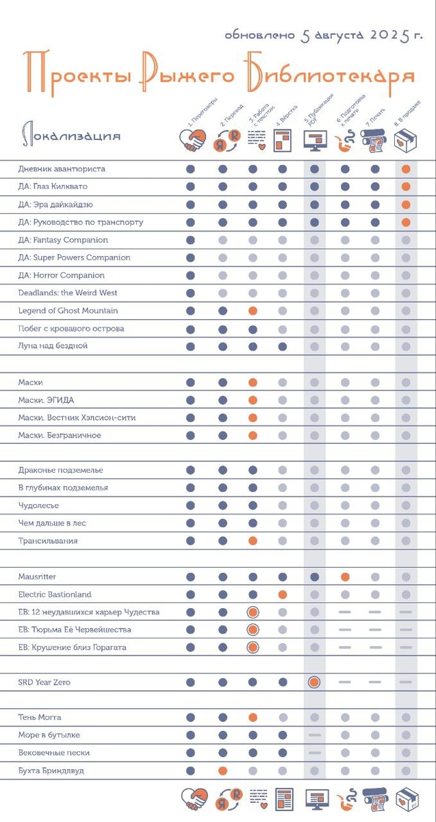 Статусы проектов Библиотекаря на начало августа Публикуем актуальные статусы проектов Рыжего Библиотекаря на август 2025 года. Вот что мы успели сделать за прошедший месяц: 1. «Savage Worlds: Дневник авантюриста» и связанные с этой игрой дополнения направлены по всем полученным нами адресам. Дневник побывал на фестивале. Уже в этом месяце книгу можно будет купить в лавке «У Библиотекаря» и других магазинах. 2. SRD (справочный документ разработчика) «Точка Отсчёта» подготовлен к публикации в формате PDF. 3. Завершён перевод и начата работа над текстом дополнений для игры «Бастион. Земли электричества»: ○ «12 неудавшихся карьер Чудества» ○ «Тюрьма Её Червейшества» ○ «Крушение близ Горагата» 4. Завершена вёрстка точек интереса для игры Mausritter: ○ «Логово совы» ○ «Пятый корпус» ○ «Ржавая башня» 5. Текст НРИ «Бабушкиберпанк» (вторая редакция) написан и прошёл редактуру. Начата работа над иллюстрированием. Условные обозначения: 🔵 — этап завершён. 🟠 — в процессе. ⚪️ — запланиров