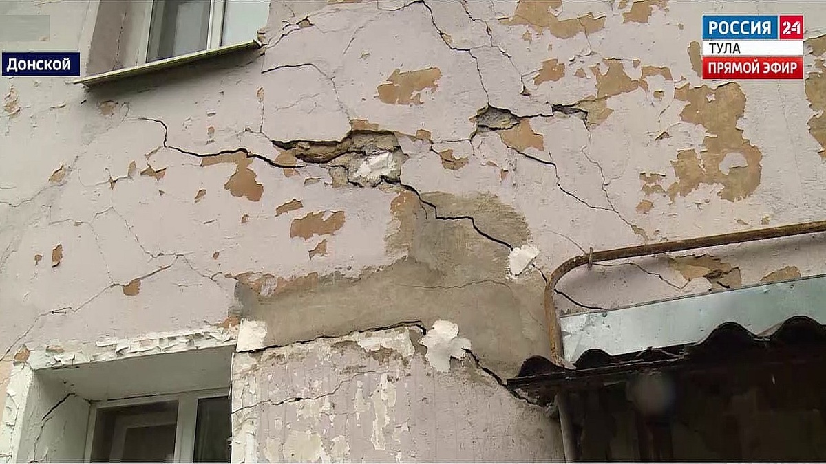Донской. Многоквартирному дому под номером три на улице Калинина скоро исполняется век. Он был построен аж в 1931 году. А в 2018 его официально признали аварийным. Этот дом еще стоит, но кажется, что больше по привычке. Жильцы опасаются, что в любой момент он может попросту сложиться как карточный домик. Процесс уже запущен. Мы видим, как выпирают наружные стены, окна отдаляются. А вот такие дырки жильцы маскируют тряпками. Но если от ветра они спасут, то от обрушения точно нет. Окна перекошены, штукатурка осыпается при малейшем прикосновении. Заходим в подъезд. Пол под ногами проседает. Внешний вид проводки настораживает. «Где проводка на скрутке, здесь сверкало. Сверкало очень сильно», – рассказывает местная жительница. Через эту дыру в квартиру по-хозяйски проникают слизни. А ветхая канализация порождает мошкару. Встрече с ними здесь уже не удивляются. На наших глазах отвалилась плитка в ванной и посыпалась штукатурка в спальне. «Вот тут трещина через всю стену. Я не знаю, как ту жи