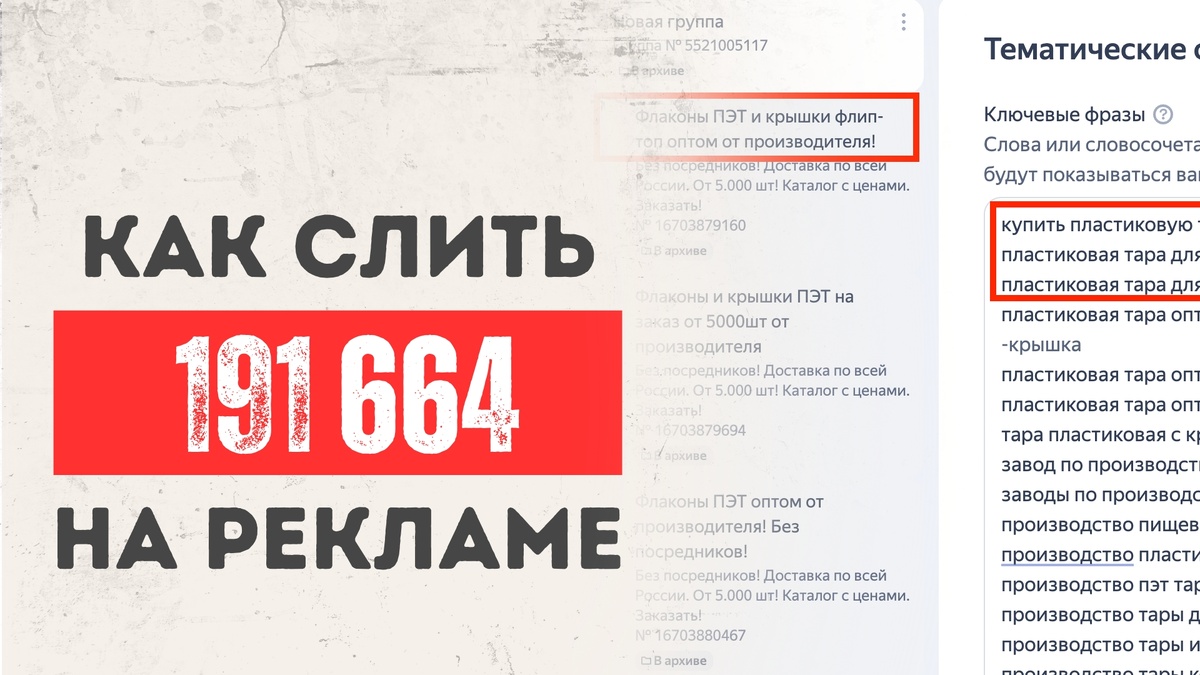 Отсутствия опыта у заказчика умноженный на некомпетентность фрилансера с Профи.ру привел к полному провалу запуска рекламного канала. Российский производитель современной ПЭТ-тары для косметики и бытовой химии решил протестировать новые каналы привлечения клиентов. Рост компании подталкивал к поиску дополнительных точек роста — и выбор пал на Яндекс.Директ как “быстрый” способ увеличения лидов. Опыт заказчика в онлайн-маркетинге был минимален, а потому подрядчика искали “по отзывам” и взяли первого свободного фрилансера на Профи.ру. К работе подошли доверительно — без подробного ТЗ, подписанного медиаплана или согласования креативов. “Вот бюджет — делайте, как считаете нужным”. Три месяца настройки рекламы обошлись компании в 191 664 рубля. За это время не пришло ни одной заявки. Когда ко мне поступил запрос на аудит рекламной кампании, выяснилось: Потрачено на поиск: 117 086,30₽