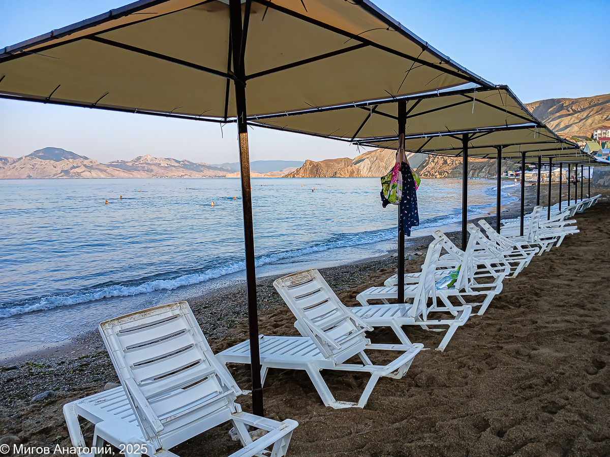 Разгадку, как мне показалось, я нашел, когда мы уже вернулись домой. Прочитал, что на Крымском мосту большая автомобильная пробка. Наверное, одна партия отдыхающих уехала ещё в субботу-воскресенье, а новые автотуристы застряли на подъезду к полуострову. Так что к обеду, скорее всего, пляж будет, как обычно, забить людьми под завязку.