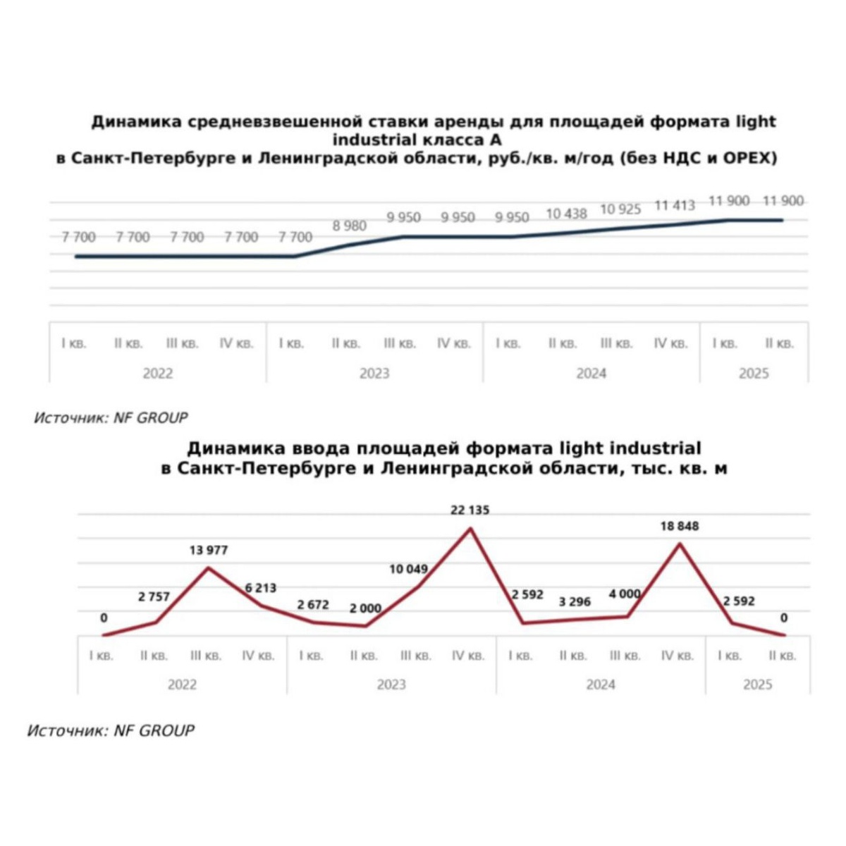 🏭 Консалтинговая компания NF GROUP также опубликовала данные по рынку light industrial в Санкт-Петербурге за первое полугодие 2025 года. Арендные ставки продолжают расти на фоне ограниченного предложения.