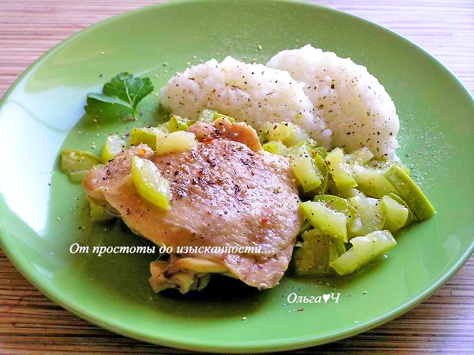 соль, перец по вкусу Приготовление: Куриные бедра посыпьте солью и смесью специй, затем обжарьте на растительном масле с двух сторон. Тушите 15 минут. Параллельно поставьте вариться рис. В сковороду добавьте нарезанный кусочками кабачок. Тушите еще 15-20 минут до готовности. Курицу подавайте с кабачками и рисом. Посыпьте смесью специй. Приятного аппетита! Вам также могут понравиться: