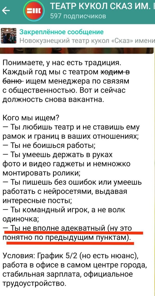 О, классика жанра! 🎭 "Любишь театр без границ" – то есть готов работать за аплодисменты и воздушные поцелуи сцены. "Не боишься работы" – читай: будем нагружать, как гастрольный чемодан, но платить, как за антрактный бутерброд. "Фото, видео, монтаж" – нужен универсальный солдат, который и контент создаст, и кофе сварит, и, возможно, сыграет вторую скрипку в крайнем случае. "Пишешь без ошибок или дружишь с нейросетями" – то есть если ChatGPT не справится, виноват будешь ты. "Не вполне адекватный" – ну тут без комментариев, иначе в театр бы не пошли. "График 5/2 (но есть нюанс)" – нюанс, конечно, в том, что "спектакли бывают и по выходным, дорогой". ☀️В общем, ищут человека-оркестра с зарплатой одного флейтиста. Но зато какая атмосфера!