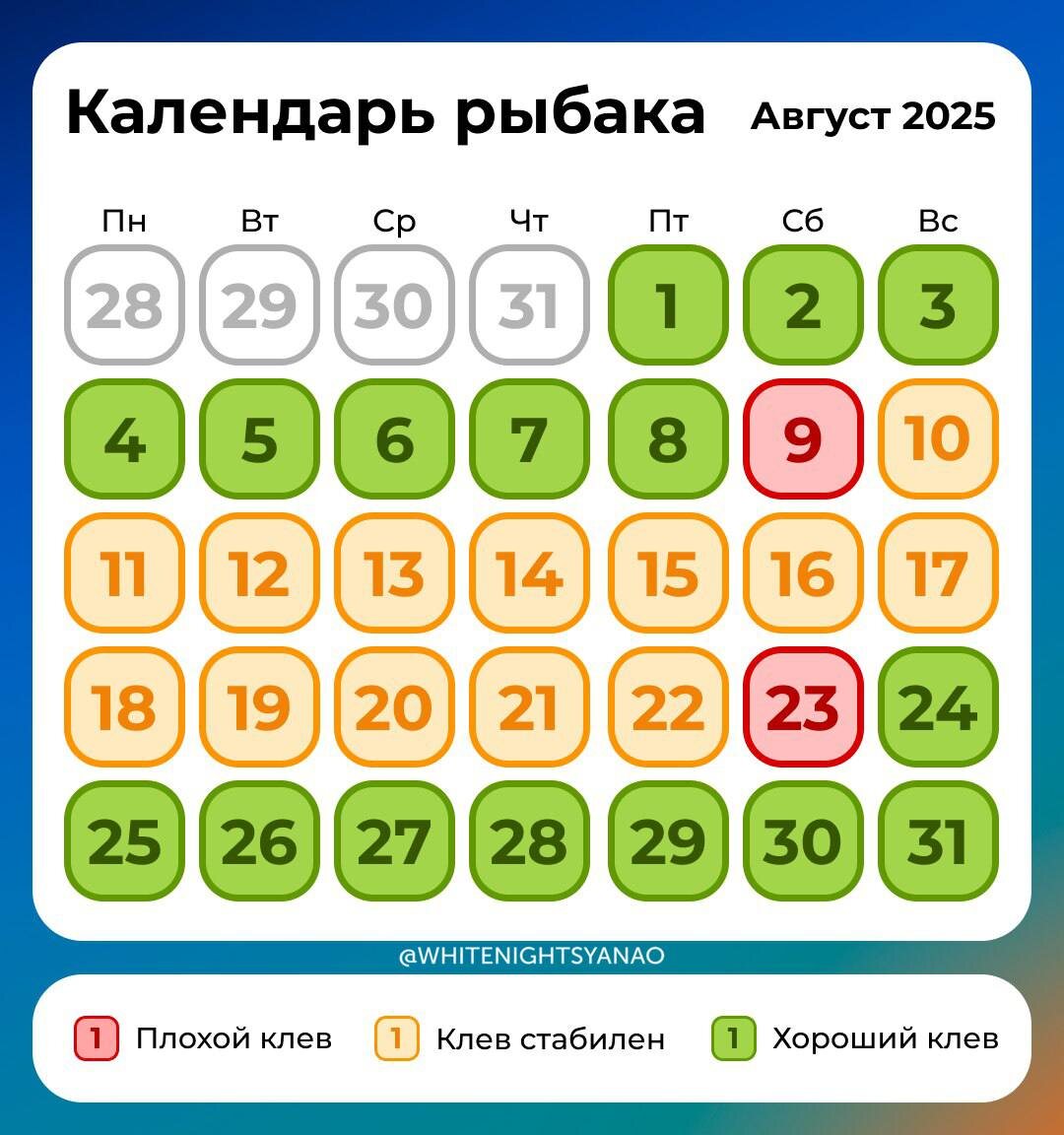 🎣 Лунный календарь рыбака на Август В августе лучше всего клюет плотва и лещ: 🩵Плотва — активизируется к концу месяца, хорошо клюет на червяка и мотыля. 🩵Лещ — предпочитает спокойные участки водоема с глинистым дном, активнее всего клюет утром. Сохраняй себе и скинь другу, чтобы успеть на хороший клев Подписаться | Прислать новость | Дать «буст»