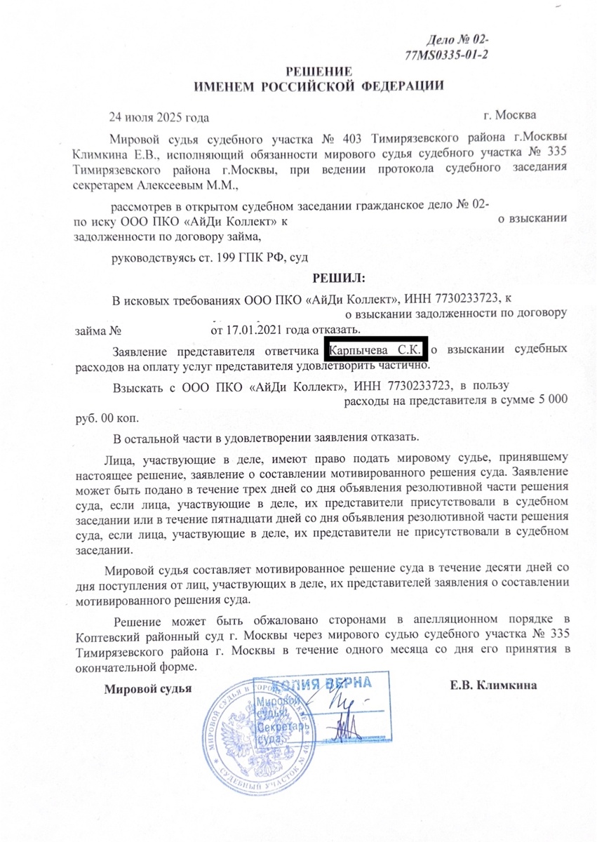 Здравствуйте, дорогие читатели моего канала! Сегодня рассмотрим с Вами судебное дело по иску ООО ПКО "АйДи Коллект" к моему Доверителю. 💰 В прошлом месяце ко мне обратился Доверитель с достаточно распространенной проблемой. Когда-то давно, в 2021 году был взят кредит на небольшую сумму. ❗️ В связи с тяжелой жизненной ситуацией, ухудшением финансового положения, совершать выплаты по кредиту возможности не было. Долгое время первоначальный кредитор никакой работы, связанной с взысканием задолженности не проводил. ✅ Спустя несколько переуступок долга, право требования перешло к ООО ПКО "АйДи Коллект". В 2023 г. был вынесен судебный приказ о взыскании задолженности, который мой Доверитель отменил в кратчайшие сроки. Подробнее о том, как самостоятельно отменить судебный приказ, можно прочитать в этой статье. ⚖️ Примерно через два года, ООО ПКО "АйДи Коллект" подает исковое заявление по адресу регистрации Доверителя. Уже на этой стадии Доверитель понял, что сам не справляется и решил довер
