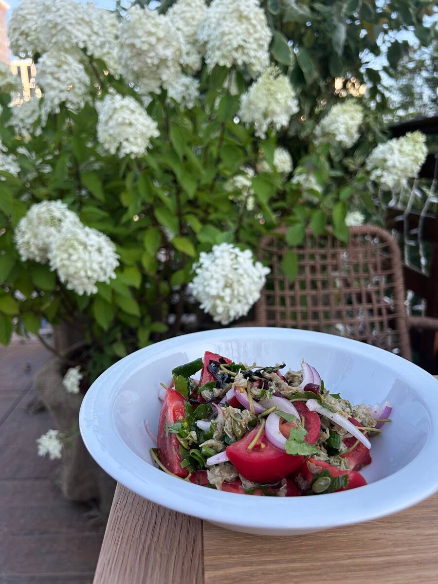 Или вот классический уже тбилисский салат: помидоры, лук, джонджоли, или воздушный губчатый сыр со свежим арбузом. Тут вообще есть целое сырное меню со всякими редкостями – гениальным сыром тенили (тонкими нитями чечила в сливках), нарчви (пахучим выдержанным мягким сванским сыром) и расплавленным в масле сыром дамбалхачо, кремовым плесневым грузинским фондю.
