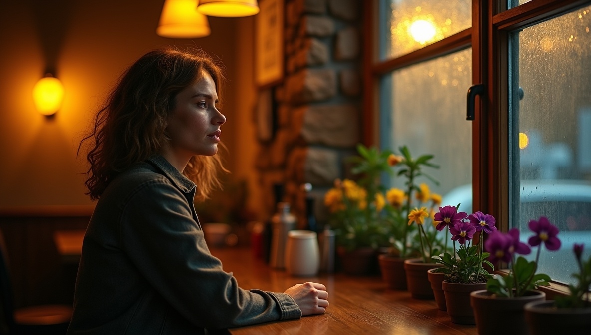 За окном моросил ноябрьский дождь, превращая вечерний Петербург в размытую акварель. Жёлтые фонари отражались в лужах, редкие прохожие спешили под зонтами. А здесь, в кафе, было тепло и пахло корицей от последних булочек, которые она так и не успела продать.
