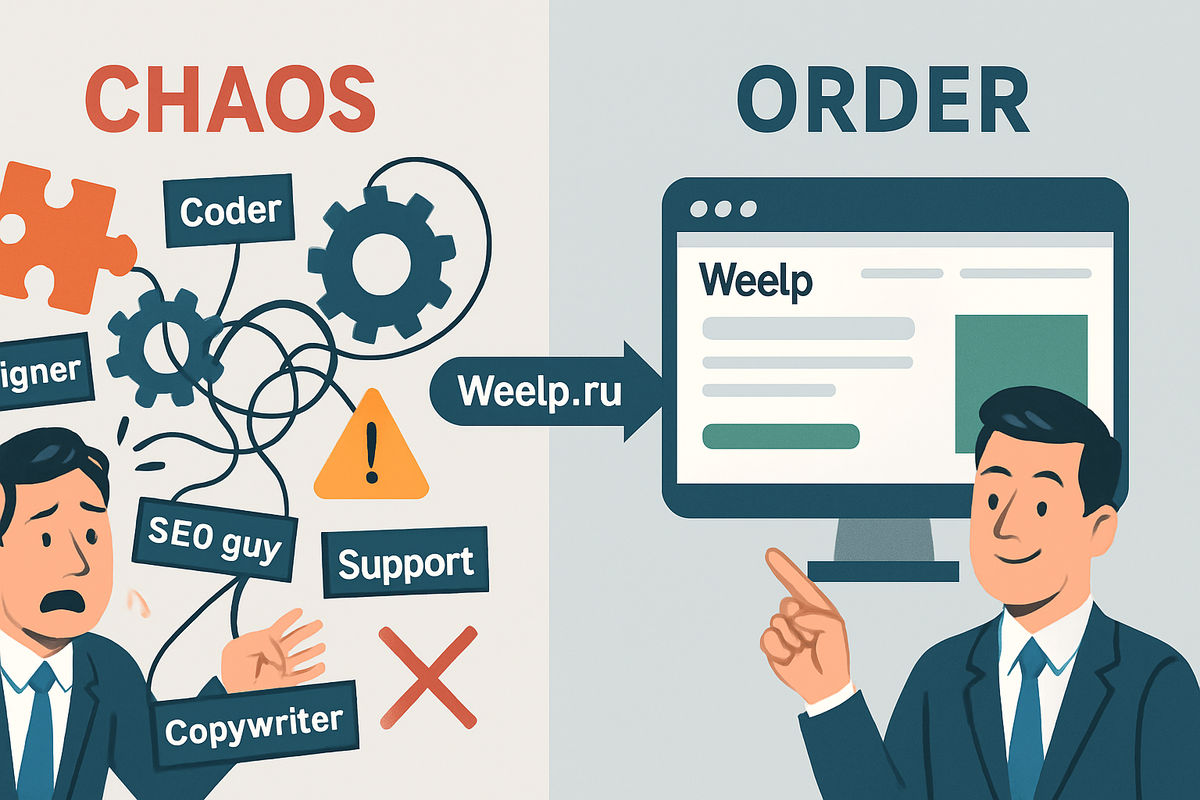 Представьте: вы наняли талантливого дизайнера, нашли гениального программиста, договорились с копирайтером и SEO-специалистом... А в итоге получили «Франкенштейн-сайт» 🤯: дизайн не стыкуется с функционалом, продающий текст не помещается в блоки, SEO-оптимизация ломает верстку, а техподдержка разводит руками и не знает, к кому обратиться. Знакомо? Если вы владелец бизнеса и уже сталкивались с кошмаром управления 5 разными подрядчиками, бесконечными чатами и поиском крайнего – эта статья для вас. Узнайте, почему комплексный подход от веб-студии Weelp не только создает гармоничный и эффективный сайт, но и экономит вам до 40% бюджета и 100% нервных клеток. 3 Скрытые Цены Работы с Разрозненными Подрядчиками (Которые Платите ВЫ) Когда вы нанимаете команду фрилансеров, вы платите не только за их работу. Вы платите за хаос. Вот его реальная цена: Цена #1: Время-Убийца (Координация и Контроль) ⏱️ Проблема: Бесконечные созвоны, согласования правок между дизайнером и верстальщиком, поиск виноват