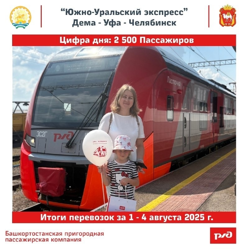 Это первый межрегиональный маршрут между Башкортостаном и Челябинской областью в формате пригородного сообщения. Первый рейс «Южно-Уральский экспресса» запустили 1 августа, сообщал «Башинформ». С 1 по 4 августа пригородный поезд уже перевёз 2 500 пассажиров, сообщили в министерстве транспорта Башкортостана. Поезд отправляется со станции Дёма по пятницам, субботам и воскресеньям, а из Челябинска – с субботы по понедельник. Ранее сообщалось, что в Башкирии на полчаса задержат отправление раевской электрички.