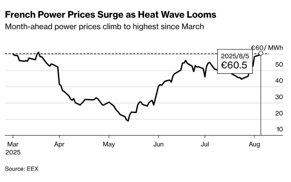 Цены на электроэнергию во Франции выросли до самого высокого уровня с марта из-за опасений, что аномальная жара повлияет на выработку электроэнергии АЭС. На юге Франции на этой неделе ожидается температура до 38°C. На прошлой неделе EDF предупредила о возможных ограничениях. Да, в прошлую пятницу EDF опять продлила простой своего ядерного реактора «Фламанвиль 3» ещё на семь недель. Всё это происходит на фоне растущего спроса на электроэнергию для кондиционирования воздуха.