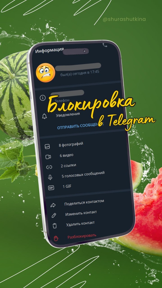 🔥 Три способа навсегда вычеркнуть токсичного человека из Telegram (и жизни)! Инструкция для iOS, Android и ПК + секретные фишки от Гриши ↓ 📱 1. Для iPhone (iOS): Блокируем за 10 секунд! Зайти в чат с нарушителем спокойствия → Тыкнуть в его имя в шапке экрана → Пролистать вниз до кнопки Заблокировать пользователя → Подтвердить красной кнопкой ✅ ❗️ Что будет: — Он исчезнет из контактов, не увидит ваш статус/аватар; — Сообщения будут доставляться (1 галочка ✅), но вы их не прочитаете; — Не сможет добавлять вас в группы/звонить. 🤖 2. Для Android: Через "тройную точку" Открыть нежелательный чат → Нажать ⋮ (три точки вверху справа) → Выбрать Заблокировать пользователя → Подтвердить во всплывающем окне ✅ ❗️ Важно: После блокировки старые сообщения останутся! Чтобы стереть историю — удалите чат вручную 🗑. 💻 3. На компьютере (ПК/Mac): Правая кнопка — ваше оружие! В списке чатов кликнуть ПРАВОЙ кнопкой мыши по имени → Выбрать Заблокировать (или найти кнопку ⋮ → Заблокировать) → Подт