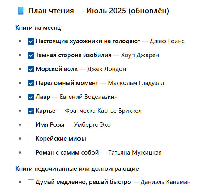 Что понравилось в июле из прочитанного 🍀 Вообще почти в каждой книге нахожу что-то интересное или полезное для себя, а здесь отмечаю те книги которые понравились больше других. 🍀«Лавр» — Евгений Водолазкин Медитативное путешествие сквозь века и человеческую душу. Книга, которую нужно читать медленно, вслушиваясь в тишину её страниц. 🍀 «Морской волк» — Джек Лондон Шторм, сила, характеры, философские разговоры. Лондон покорил своей разноплановостью. 🍀 «Картье» — Франческа Картье Бриккел История легендарного дома глазами члена семьи. Красиво, вдохновляюще, с погружением в мир ювелирного искусства и амбиций. 🍀 «Переломный момент» — Малкольм Гладуэлл Про то, как маленькие изменения создают большие последствия. Книга-линза, через которую начинаешь по-новому смотреть на привычные процессы и решения. Каждая из этих книг по-своему расширила границы — от морского путешествия до путешествия внутри души. 🌊✨ Пространство: Книжный путь