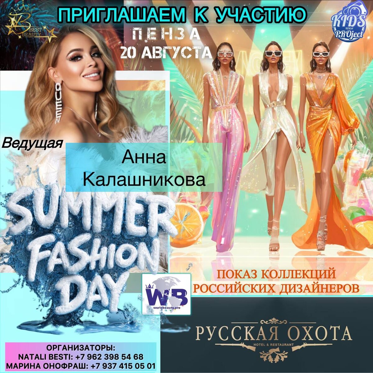 Не пропустите модное событие! 🤩💕 20 августа — SUMMER FASHION DAY пройдет в Пензе в «Русской охоте». 👗 Дизайнеры со всей России 🎤 Ведущая и хедлайнер — телерадио-ведущая, певица, fashion diva, эксперт федеральных каналов Анна Калашникова ⭐️ 📸 Красная дорожка, подиум, свет софитов и ты — в центре внимания Такого ещё не было: подиум под открытым небом, дизайнеры из разных уголков страны, магия заходящего солнца и таинственные прожекторы, подчеркивающие силуэт каждого образа. 💫 Ты можешь стать частью этого зрелищного модного действия! ✨ Приглашаем к участию: 👸🏼 ДИЗАЙНЕРОВ — покажите свои коллекции на модном подиуме перед стильной аудиторией и медиа 📸 ФОТОГРАФОВ и ВИДЕОГРАФОВ — создайте контент, который будут обсуждать в соцсетях 💄 BEAUTY-МАСТЕРОВ — визажисты, парикмахеры, стилисты для работы за кулисами модного шоу 🛍 БРЕНДЫ И МАГАЗИНЫ ОДЕЖДЫ ✨ УЧАСТНИКОВ ДЛЯ ДИЗАЙНЕРСКИХ ПОКАЗОВ. 📍Локация: уникальное место — РУССКАЯ ОХОТА | загородный отдых | Пенза 🌅 Время: магическ