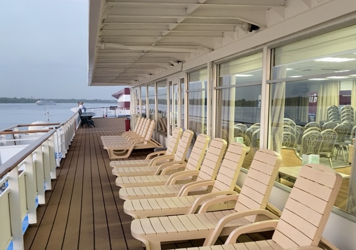 Сам теплоход «Александр Радищев» — не новый, но находится в хорошем состоянии. Есть шезлонги, где можно позагорать на солнце, посидеть с книжкой или просто полюбоваться видами Волги. Была даже зона с тренажёрами, если вдруг захочется согнать всё съеденное за ужином, но мы туда так и не дошли.