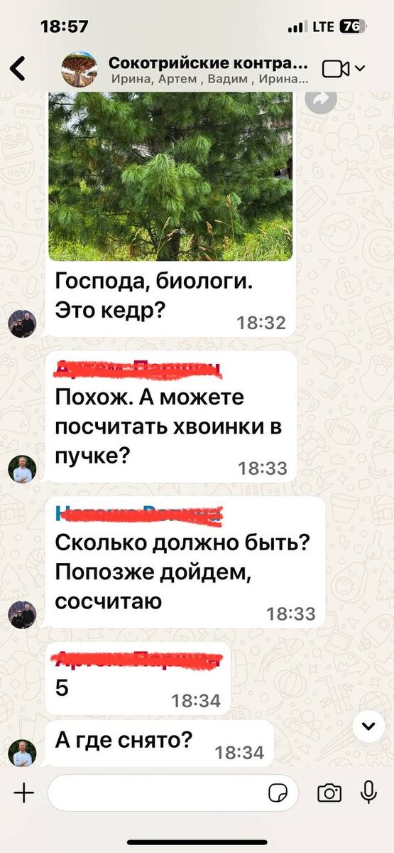 Почти пол года, как мы вернулись с Сокотры. Чат группы активен каждый день! Обсуждается все - дети, коты, коньки, работа, при чем по разным направлениям. Но вы только посмотрите на эту переписку) И это уже казалось бы далекие от зеленой отрасли товарищи копают кедры под Костромой) Это передается каким то немыслимым путем вероятно)