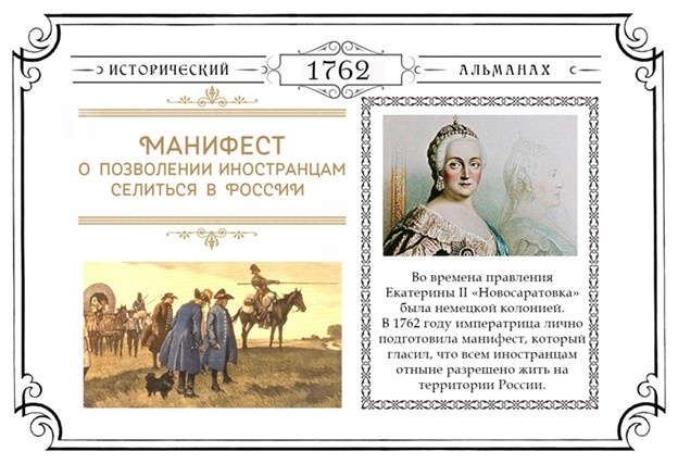 4 декабря 1762 года Екатерина издала манифест о привлечении иностранцев в Россию: