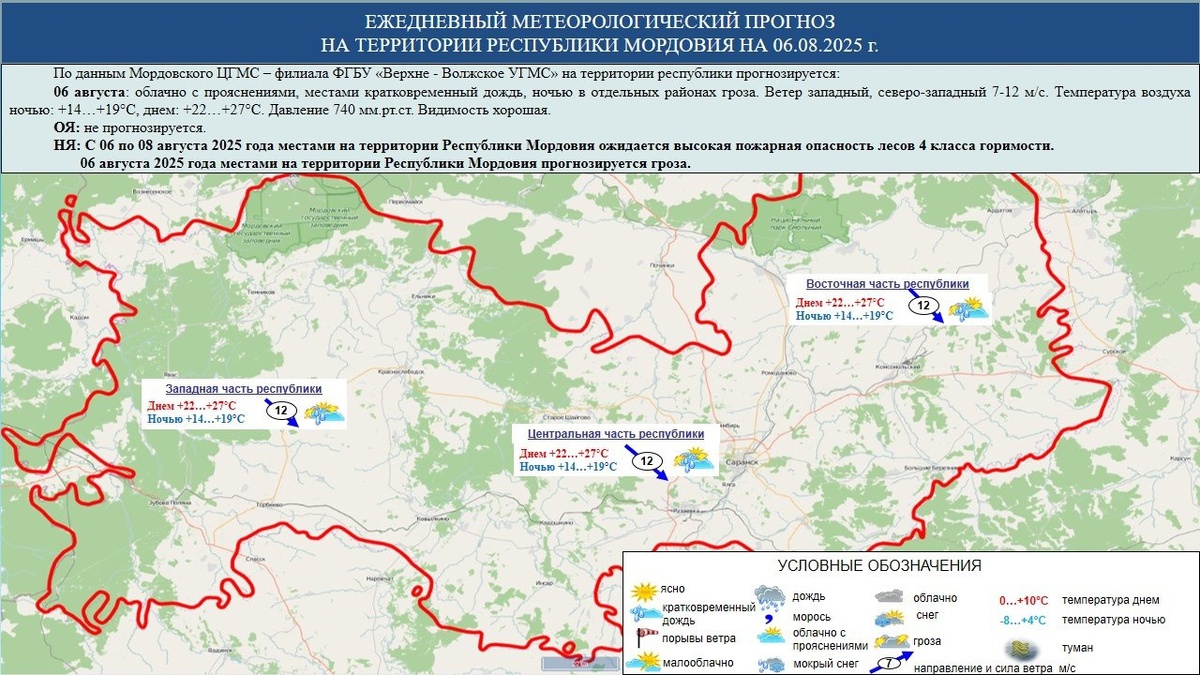☁️⛅⛈️ 6 августа в Мордовии облачно с прояснениями, местами кратковременный дождь, ночью в отдельных районах гроза
