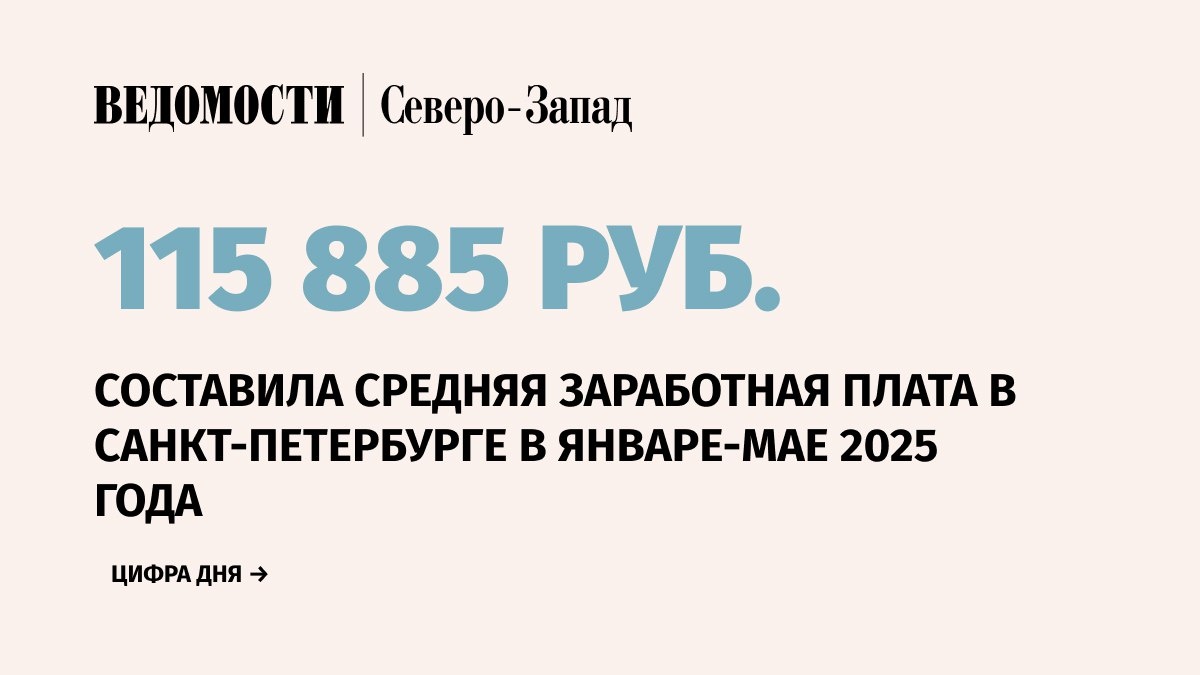 Средняя начисленная заработная плата на одного работника в Санкт- Петербурге в январе-мае 2025 г. составила 115 885 руб. Она выросла на 12,8% по сравнению с аналогичным периодом 2024 г., следует из данных Петростата. ⚪️Наибольшая средняя заработная плата за пять месяцев зафиксирована в сфере добычи полезных ископаемых, она составила 290 478 руб. Однако по сравнению с январем-маем 2024 г. она снизилась на 0,8%. ⚪️Далее идут сферы водного транспорта – 201 278 руб., воздушного и космического транспорта – 195 906 руб. ➡️ Самый большой прирост средней заработной платы за январь-май 2025 г. по сравнению с аналогичным периодом 2024 г. замечен в сфере гостиниц и предприятий общественного питания – на 23,2%, до 69 495 руб., и предоставлении прочих видов услуг – на 25,2%, до 77 344 руб. На 18,4%, до 112 737 руб., выросла средняя зарплата в области здравоохранения и социальных услуг. 📰 Подпишитесь на «Ведомости Северо-Запад»