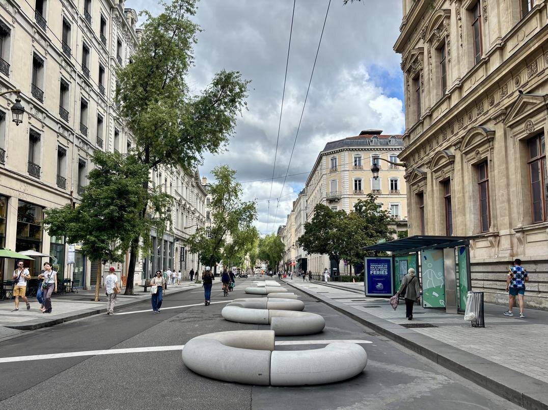 Во французских пабликах разгорелись нешуточные баталии вокруг новых лавочек, появившихся на одной из улиц Лиона, которая недавно стала пешеходной. Местная мэрия потратила на благоустройство 50 тысяч евро, купив на эту сумму 41 скамью, быстро получившую в народе прозвище «ver», что переводится как червяк или глист. Мы не сторонники пустых осуждений и придерживаемся принципа «критикуешь — предложи, как можно сделать по-другому». Потому, как специалисты по производству малых архитектурных форм, взяли на себя смелость порассуждать на тему, как еще можно обустроить данную улицу. Что мы имеем Объект, который видим перед собой — пешеходная улица с бывшей дорогой для общественного транспорта и тротуарами с двух сторон. На первых этажах зданий расположены точки торговли. Точную длину улицы мы не знаем, но обычно подобные виды скамеек имеют длину 1,5–2 метра. Визуально по фото они ближе к 1,5 метрам. Известно, что мэрия приобрела 41 лавочку, получается 61,5 м скамеек, плюс расстояние между секц