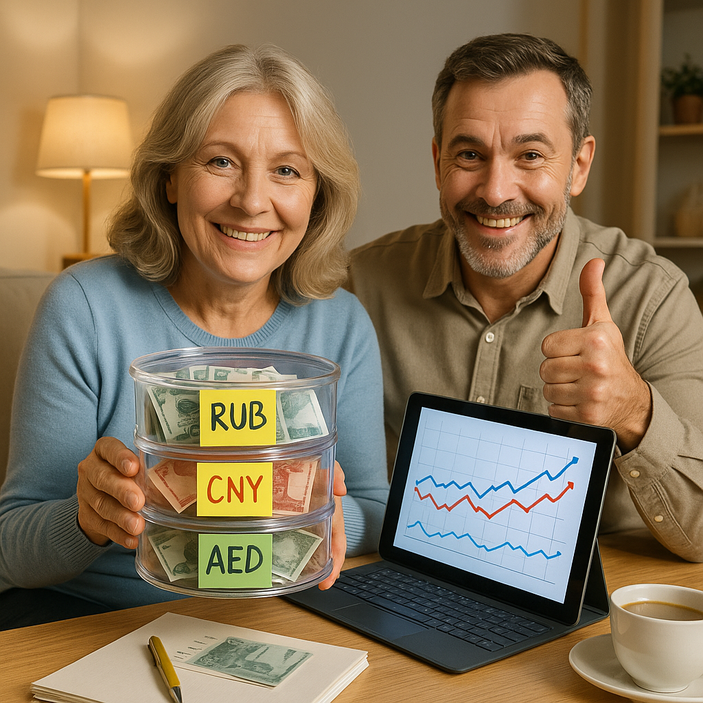 Чтобы сбережения не «качало», разумно разложить их по разным корзинам. Без него не обойтись: коммуналка, пенсионные взносы, продукты — всё в нацвалюте. Доля в копилке: 40–50 % для оплаты ежемесячных расходов и «подушки» на 3 месяца. Доля: 25–30 % — долгосрочная часть портфеля. Доля: 15–20 % — «мостик» к долларовой зоне без прямых рисков. Сохранять «зелёный» можно — но есть нюанс: наличные хранить проще, чем безнал. Переводы «дальше Турции» ограничены, карты без кэшбэков и иногда «обнуляют» интернет-платежи. Поэтому Доля USD: до 10 % для поездок в «долларовые» страны или крупных онлайн-покупок. ❓ Можно ли хранить всё в юанях — он же «надёжный»?