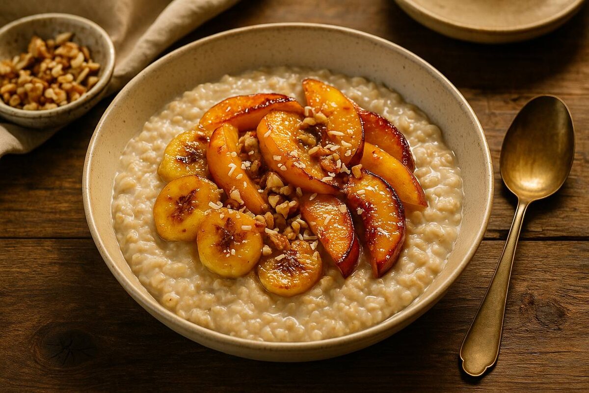 Когда завтрак становится рутиной, даже любимая овсянка перестаёт радовать. А ведь хочется начать день с чего-то уютного и вкусного — так, чтобы и тело проснулось, и настроение включилось. Мы нашли простой способ превратить обычную кашу в утреннее удовольствие: добавили кокосовое молоко и карамелизированные фрукты. Получилось будто бы десерт, но без капли лишнего — и красиво, и полезно. О каше можно сказать многое. Но главное — это один из самых сбалансированных завтраков. Овсянка, например, даёт долгую сытость, поддерживает уровень энергии, бережно работает с пищеварением. А если приготовить её не на коровьем молоке, а на кокосовом — получится нежнее и легче, особенно для тех, кто избегает лактозы. Фрукты? Это и клетчатка, и витамины, и нужная сладость без сахара. А если слегка обжарить их с ложкой мёда — выйдет карамельный вкус, за который в кафе легко берут немалые деньги. Но дома — это просто. Ингредиенты (на 2 порции): • овсяные хлопья — 1 стакан • кокосовое молоко — 250 мл • вода