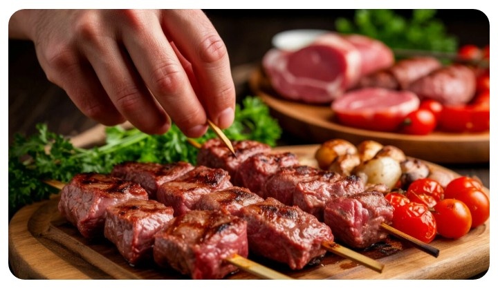 🟢 Часть 2: Мясо — это основа. Всё начинается с уважения 🟢 Шашлык начинается не с огня и не с мангала. Он начинается с выбора мяса. А точнее — с уважения к продукту, из которого ты хочешь получить удовольствие. 🟢 Я всегда считала, что мясо — это не просто "что осталось в магазине", а главный герой всей истории. И к нему нужно подходить так, как к выбору собеседника на пикнике: с доверием, знанием и чуточкой интуиции. --- 🟢 🥩 Какое мясо — правильное? Для классического шашлыка у меня был один принцип: "Лучше меньше, да лучше". Если свинина — то не абы что, а шея. Мраморная, с прослойками — не слишком жирная и не сухая. Если баранина — то мякоть с задней части, и обязательно без сильного запаха (старое мясо сразу выдаёт себя). Говядина сложнее — она требует терпения и маринада с мягкими кислотами (кефир, вино, гранатовый сок). А вот курица — да, её легко испортить пересушкой, но если замариновать правильно — получается идеальное блюдо и для детей, и для пожилых. --- 🟢 🧄 П
