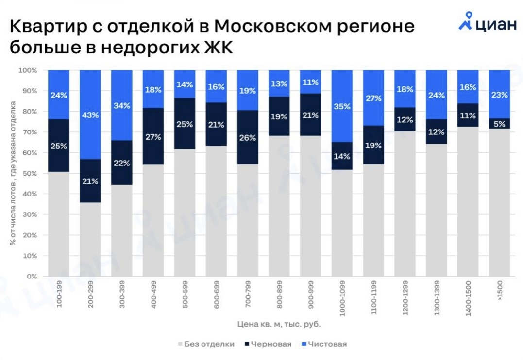 Снижение спроса, рост ставок по проектному финансированию, дефицит рабочей силы привели к уменьшению доли квартир, куда можно заселиться сразу после получения ключей. Если в 2021-2023 гг. отделка была в 2 из 3 вариантов, то сейчас соотношение изменилось на «один к одному». Чаще всего она встречается в ЖК класса «комфорт» (причем, ближе к его «нижней границе») с ценой метра до 300 тыс. руб. Еще один локальный максимум для показателя - в сегменте «бизнес плюс» (1,0-1,2 млн руб. за «квадрат»). Это наиболее конкурентные рынки. На них девелоперы (несмотря на все сложности) стараются сохранить в предложении больше лотов с отделкой. Алексей Попов, руководитель Циан.Аналитики Много факторов наложилось на то, чтобы толкнуть прожрди новостроек в сегменте комфорт-класса с отделкой: Мы в G-kvartal с коллегами из компании «Этажи» сейчас отмечаем повышенный интерес со стороны покупателей и увеличение роста стоимости в этом сегменте. Считаем это только началом, дальше будет веселее.📈 «хочу