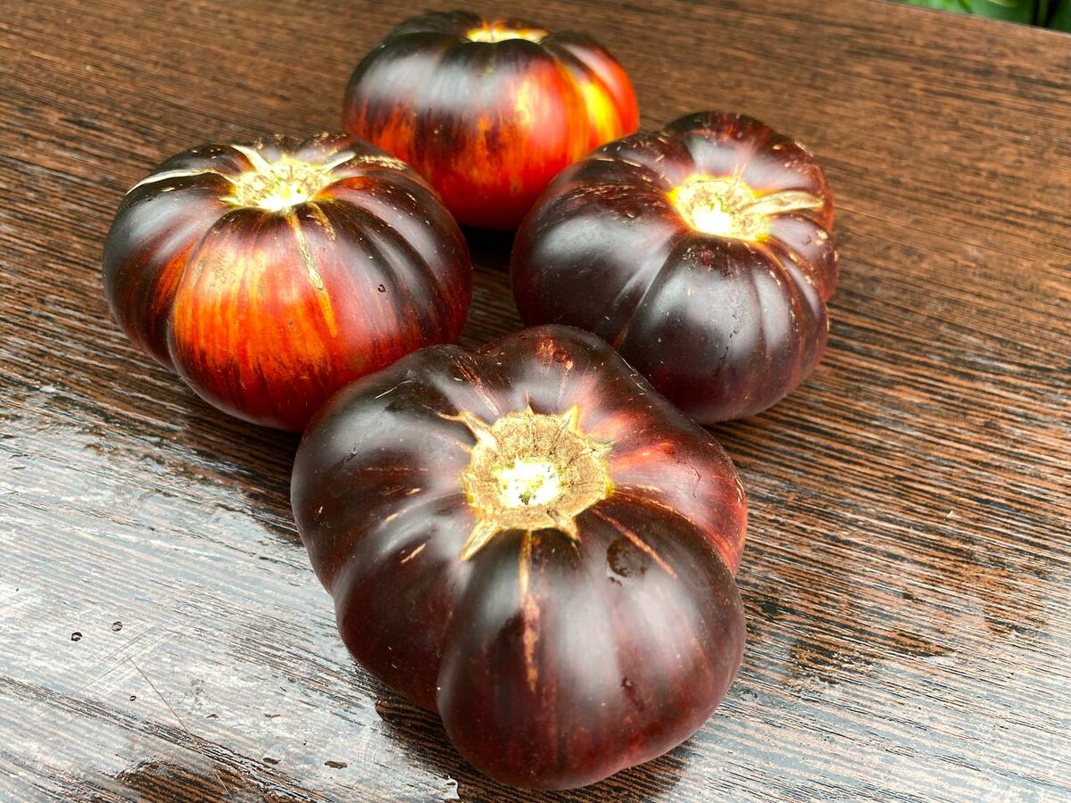 Сорт-красавец Мост над неспокойной рекой. Оранжевые с красным и синими, почти чёрными антоциановыми плечиками с малиновой мякотью.