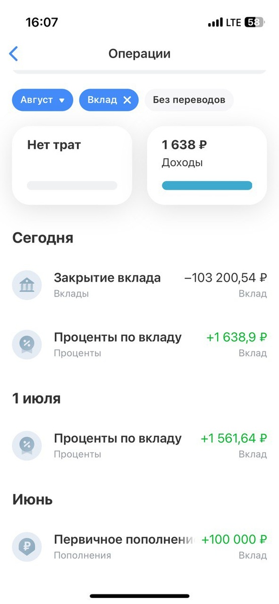 1.06.2025 открыл вклад в Т-банке два месяца, о чем сразу написал в своем телеграмм канале https://t.me/kapchagai Естественно пополнил вклад деньгами с кредитных карт. 1 августа 2025 года вклад закрылся и забрал КЭШ.