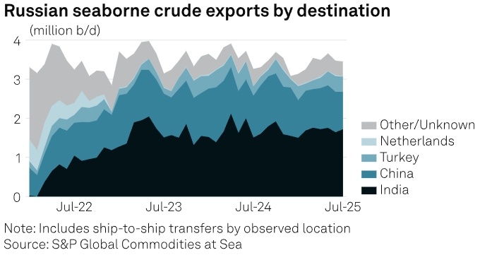 Общий экспорт продукции упал до самого низкого уровня с августа 2024 года. По данным систем отслеживания грузов, морской экспорт сырой нефти из России в июле упал до пятимесячного минимума. По данным S&P Global, отгрузка российской сырой нефти из российских портов за месяц достигла 3,46 млн б/д, что немного ниже показателя в 3,47 млн б/д в июне и является самым низким показателем с марта, поскольку покупатели в Китае сократили закупки на фоне технического обслуживания НПЗ. В июле Россия экспортировала 956 тыс. б/д 2-му по величине покупателю, Китаю, что на 8% меньше, чем в предыдущем месяце, и является самым низким показателем поставок в Китай с декабря 2022 года. Напротив, объемы поставок в июле крупнейшему покупателю, Индии, выросли на 5% по сравнению с предыдущим месяцем и составили 1,72 млн б/д. Участники рынка заявили, что спрос на российскую нефть марки Urals в Индии может резко снизиться после запрета ЕС на импорт продуктов, полученных из российской нефти, что может привести к у