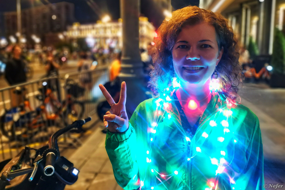 Мой второй ночной велофестиваль. В этот раз был другой маршрут: ехали по Садовому кольцу. Старт - на Зубовской площади, финиш там же. Привычные 15 с половиной километров с подъемом на Земляном валу. Говорят, было 55 тысяч участников! Кого только не было, и мерцающие феечки, и светящиеся скелеты, и какие-то неведомые переливающиеся персонажи. Некоторые прям заморочились и даже участвовали в конкурсе костюмов. Я пошла по простому пути и нарядилась... в новогоднюю елку. Обмоталась гирляндой, в ушах серьги-лампочки и вперед))))) В стартовом городке выдавали питьевую воду. Сенежская в бутылках - слишком по-хипстерски. Только хардкод, только Мосводоканал!)) Периодически на пути встречались световые шоу, выступления артистов проекта "Музыка в метро", диско-автобус со светомузыкой и дымом, девушки со светящимися обручами и даже странный неоновый куб с велотренажерами (непонятно зачем). Видео снимала мало, потому что ехала. Не умею снимать на ходу. Обратите внимание на парня в конце ролика, пря