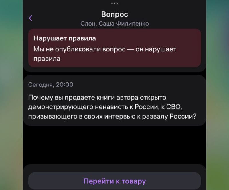 Этот вопрос подписчицы, по мнению Вайлдбериз, нарушает правила. А Саша Филипенко, который открыто выступает за развал России, ничего не нарушает. Поэтому его книжка продается на площадке. Кто не в курсе ситуации – вот посты по теме: раз, два и три. В Беларуси, кстати, чьим гражданином этот индивид является, его книжку изъяли из продажи ровно в день появления. Но там же сам Батька говорит, что у них диктатура. А у нас демократия. Яблочный Стас