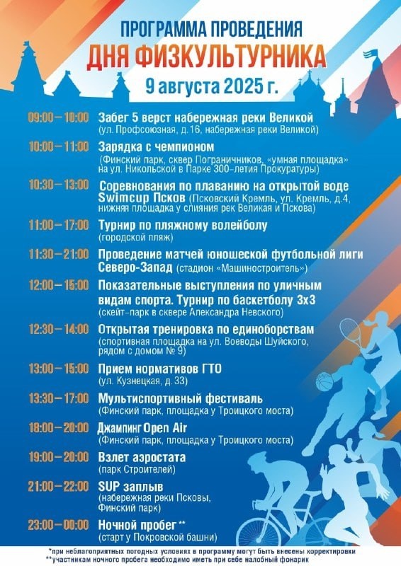 ❗️ Опубликована программа празднования Дня физкультурника в Пскове
