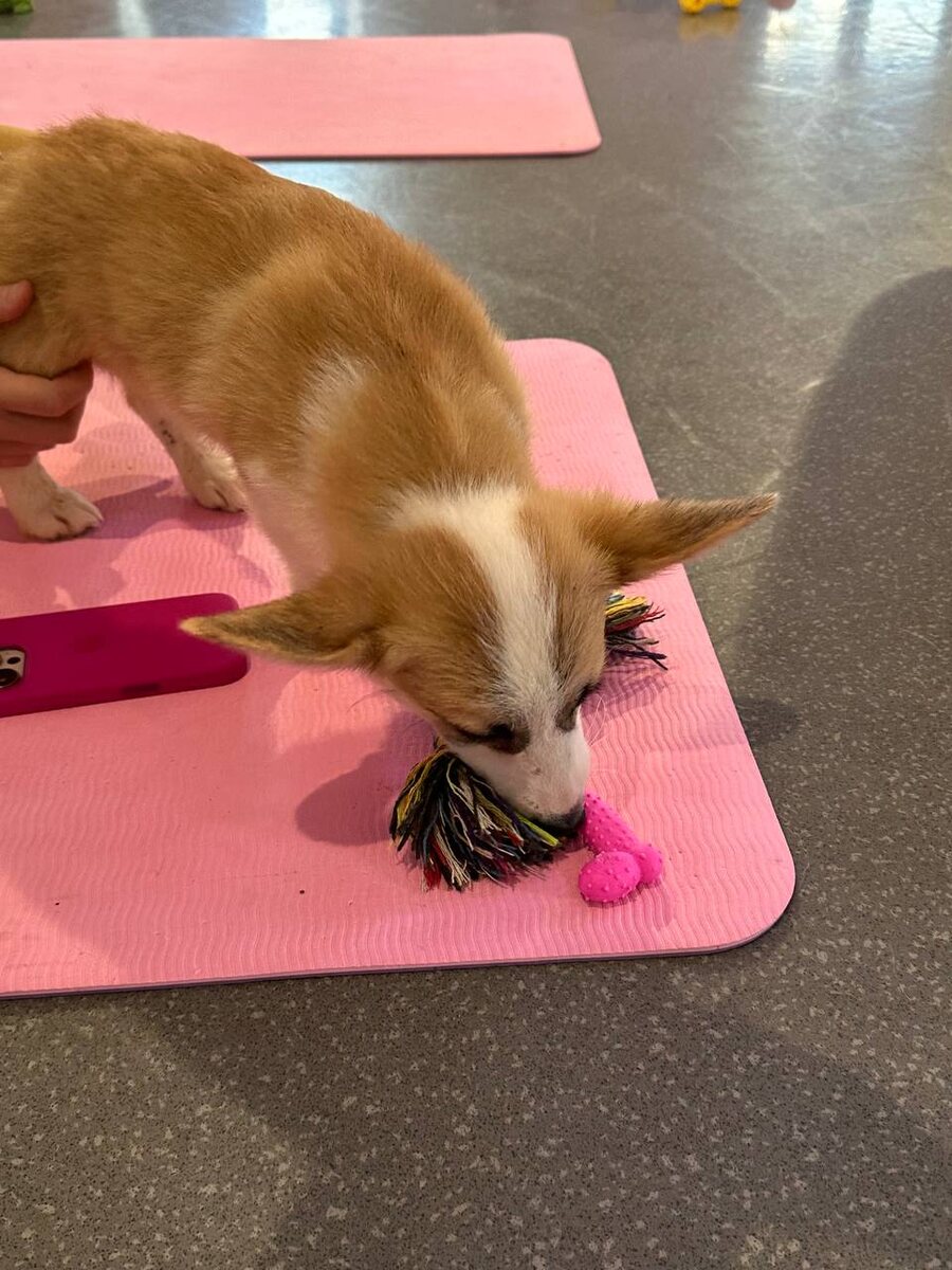 В интернете уже давно набирает популярность такая вещь, как йога с щенками. И в Нижнем Новгороде тоже появились такие занятия, поэтому сегодня расскажу, что это, для чего и кому от этого польза. Итак, мы попали на йогу с щенками корги. Занятия проходят два раза в неделю по воскресеньям. Щенки обычно разные, нужно отслеживать информацию непосредственно в группе. Так, можно сходить на занятие с самоедами, мальтипу, той-пуделями, сиба-ину и даже с мопсиками или алабаями! Занятие длится час в специализированной студии. Есть комфортная раздевалка для мужчин и женщин, стойка регистрации и просторный зал. На занятии вам предоставляют коврик и бутылку воды. В зале присутствует около 10-12 человек, а также 6-7 щенков. Как проходит само занятие? Сначала вы заходите в зал, где уже бегают малыши. Предварительно вы слушаете инструктаж, отмечаетесь и обрабатываете руки антисептиком. У вас есть минут 5-10 свободного времени, пока вы выбираете коврик и знакомитесь с игривыми щенками. Затем начинается