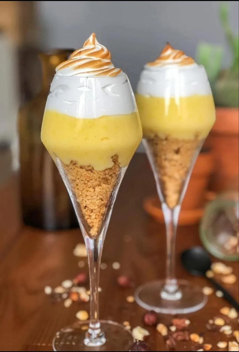 #десерт Лимонный веррин🍋 Рецепт на 4 стакана: Крамбл: 90г муки 60г коричневого сахара 60г мягкого сливочного масла 30г ореховой крошки. Лимонный крем: 75 г лимон сока цедра 2 лимона 100г сахара 2 яйца и 50 г сливочного масла. Безе: 2 белка, 150 г сахара, 50 г воды. Разогреть духовк 200 градусов. В миске смешать все ингредиенты для крамбла и перемешайте кончиками пальцев до получения слегка густой песочной текстуры. На лоток, застелить пергамент,выложите крамбл, выравнить и выпекать до золотистого цвета. Выньте из духовки и дать остыть, далее разломать на крупные куски. В миске растереть сахар с цедрой.Добавьте яйца и лимонный сок,перемешать. Миску на водяную баню и взбивайте, пока смесь не станет похожа на крем. Добавьте сливочное масло и перемешайте. Нагрейте сахар и воду до 59°C. Когда сироп достигнет 60°C, начните взбивать белки, пока венчик не оставит следов, и вливайте сироп небольшими порциями, пока он ещё горячий. Взбивайте, пока безе не остынет. Всем позитива друзья 🙌